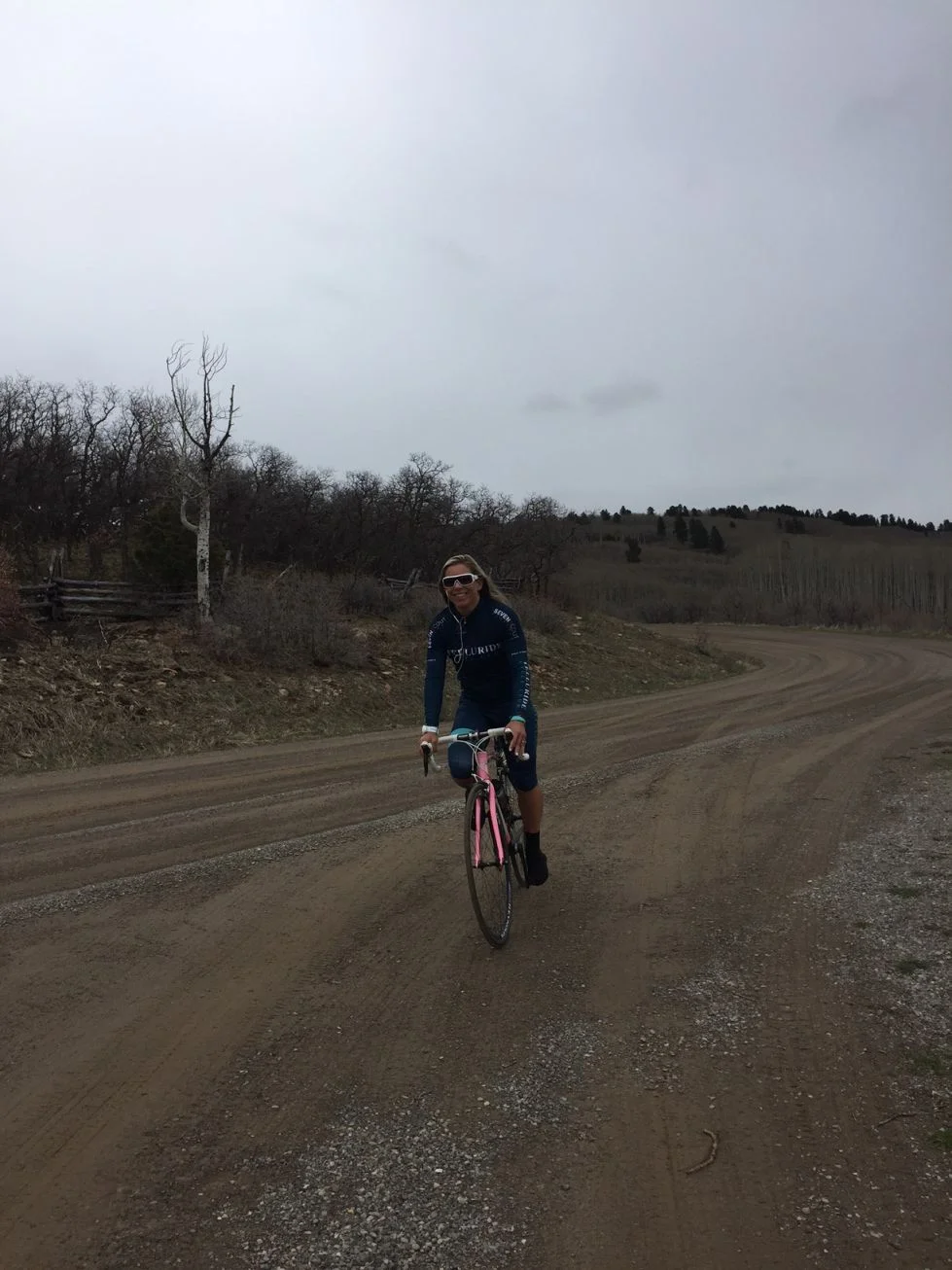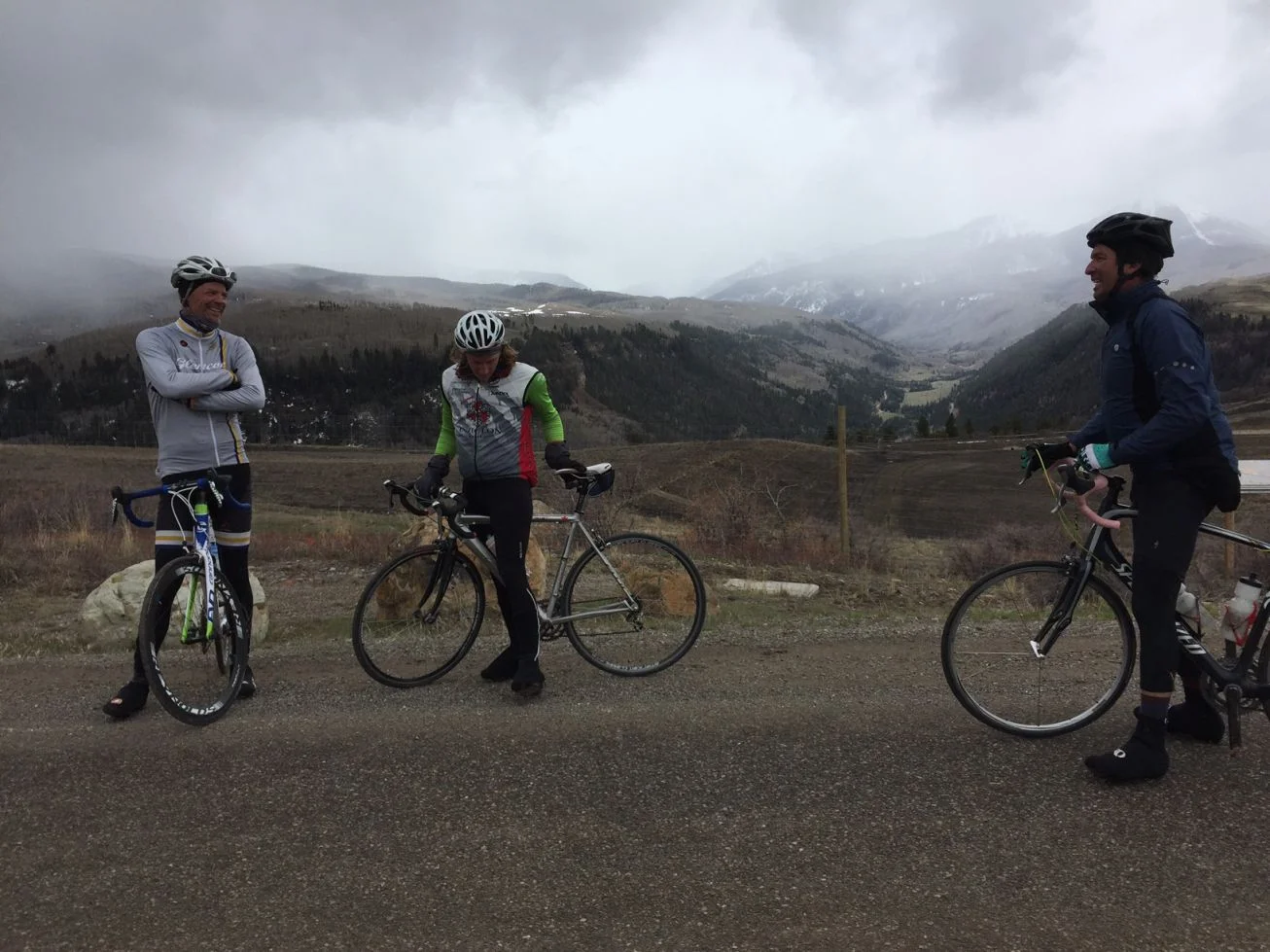 Well, we rode like this, up valley to the Concrete Boob where up ahead we spotted the pink jacket hosted by my wife Becca. Once marked, Max and Tim went, Scott and I remained eventually catching up to them at the turn up Deep Creek Road. Here we regrouped, Max, the good host, like a mother hen, gathering her chicks, got us together and on we went on the last leg. This road is something we have done before and we all went at it at our own paces. I really love this stretch of dirt. It’s steep but beautiful and rides along the creek. The sound of the water kept me company as I dangled between riders; standing, seating, standing, seating. Good times although by now I was feeling the mileage. Eventually, we turned out of the canyon, the spectacular mountain views greeting us, all mysterious with their peaks shrouded by cloud and fog. Along the top road ahead I could see Becca’s pink jacket reaching the top of Airport Road.