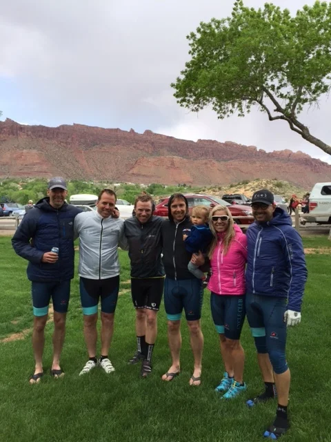 We arrived in Moab around dinner time and went straight to registration. The folks at the booth ran the sign in process with the precision of German engineering and little sense of humor. We're almost through, when we see Tim come in, so we chat and decide to have dinner together right around the corner at the Broken Oar Restaurant. The place is nice although slightly tilted towards the geriatric crowd, but the waitress was sweet and well versed in her knowledge of the menu specifically the "home made" deserts that she made a point of clarifying that they were indeed "home made". We ate, skipped the dessert, then headed to City Market for bars, water and what-have-you. Conveniently, Oz, Chris, Noah, Kelly and Beckett were staying at the campground right around the corner. In we pull to say hi, as the gang is coming back from dinner and so the sarcastic jokes start; mostly about systematic doping that we know enough about to sound smart. We laugh, get loud but eventually calm down to take some photos.